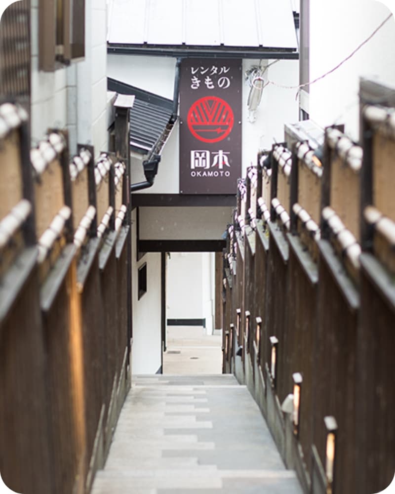 「レンタル着物岡本」は、観光着物レンタルの発祥店として京都に7店舗を展開しています。すべて観光地に位置し、大型店舗として運営されているため、多くのお客様からご満足いただいており、年間20万人以上の方にご利用いただいています。